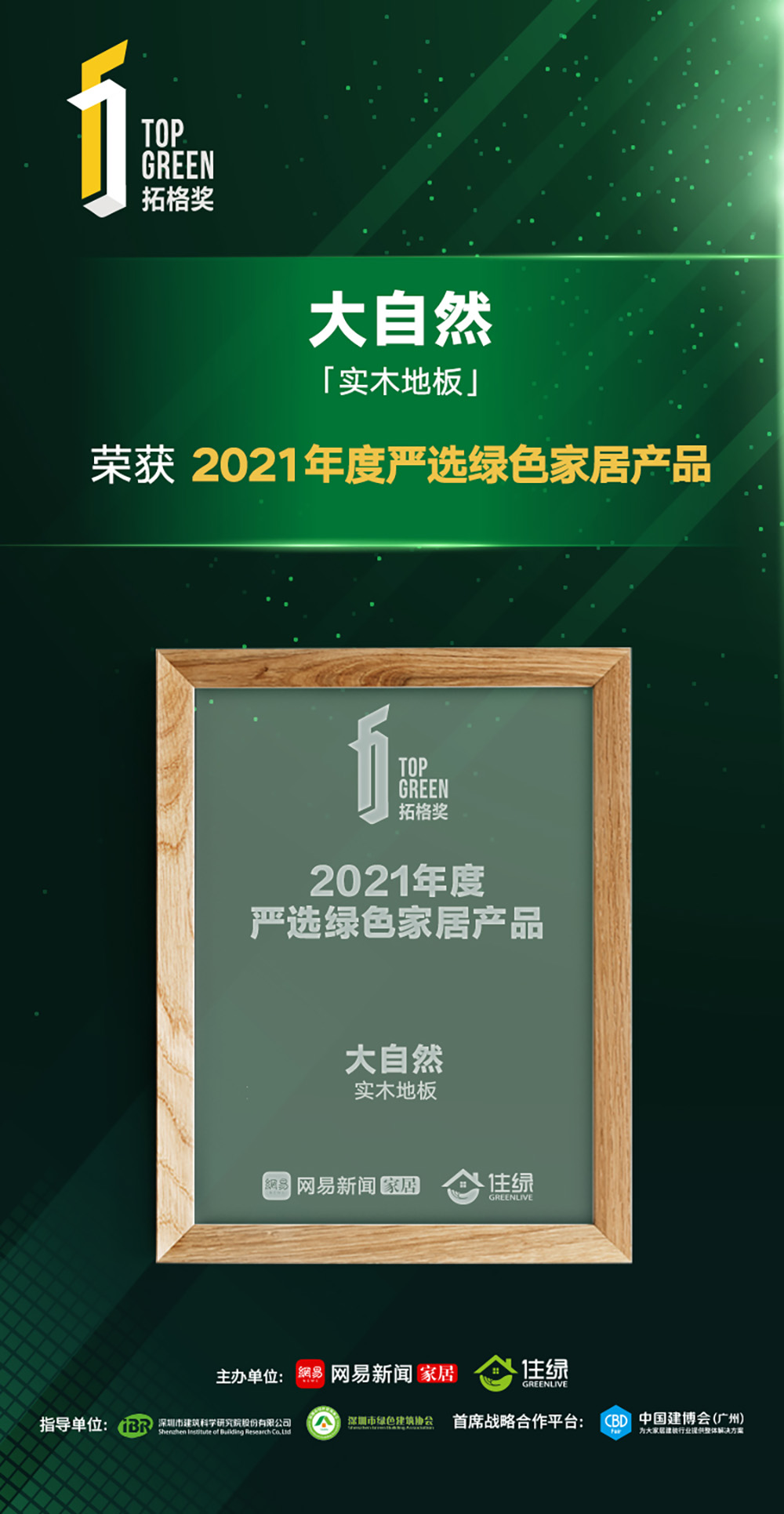 2022年1月15日,“嚴(yán)選好家 向好生活提案——2021網(wǎng)易中國家居冠軍榜暨拓格獎頒獎盛典”在線上隆重舉行,家居領(lǐng)袖齊聚云端,共襄行業(yè)年度盛宴。大自然家居憑借實(shí)力獲得“2021年度中國家居冠軍榜行業(yè)領(lǐng)軍品牌”和“2021年度綠色環(huán)保先鋒品牌”兩大獎項(xiàng),大自然實(shí)木地板榮獲“2021年度嚴(yán)選綠色家居產(chǎn)品”。