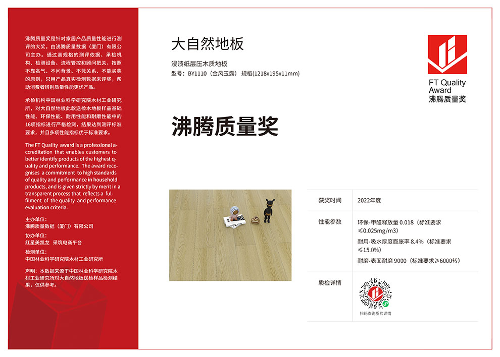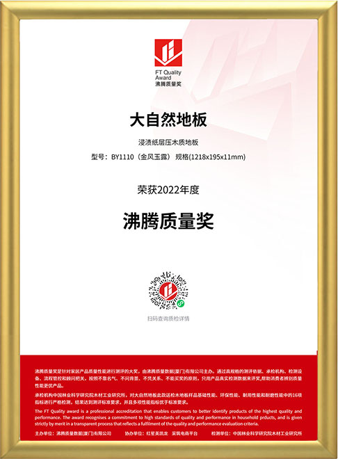 “設(shè)計(jì)看紅點(diǎn)獎,質(zhì)量看沸騰獎”!2022年7月9日,掌握2大核心科技的大自然家居蟬聯(lián)“沸騰質(zhì)量獎”,其獲獎產(chǎn)品金風(fēng)玉露(型號:BY1110)融合了“零醛智造”和“防水科技”,16項(xiàng)性能指標(biāo)遠(yuǎn)遠(yuǎn)優(yōu)于國家標(biāo)準(zhǔn)。這是繼去年大自然家居實(shí)木地板二翅豆(型號:D1348P)獲獎后,該公司再次獲得該大獎。