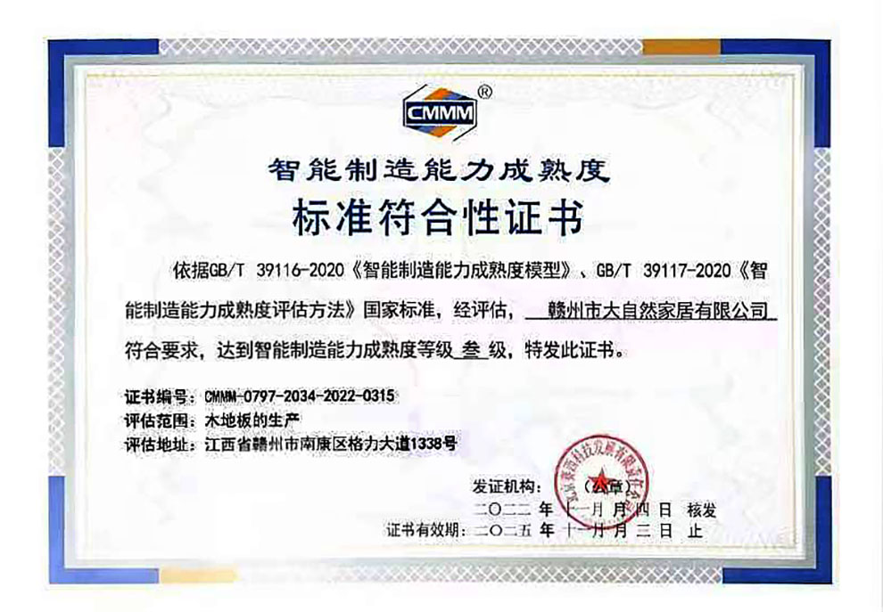 2022年11月4日贛州市大自然家居有限公司順利通過了智能制造能力成熟度評(píng)估(簡(jiǎn)稱“CMMM評(píng)估”)專家復(fù)核,成為行業(yè)首家通過智能制造能力成熟度三級(jí)評(píng)估。企業(yè)結(jié)合?動(dòng)化產(chǎn)線的物聯(lián)集成,實(shí)現(xiàn)了全流程數(shù)據(jù)的追溯和分析應(yīng)用,以此持續(xù)提高效率、提升效能、提增效益。